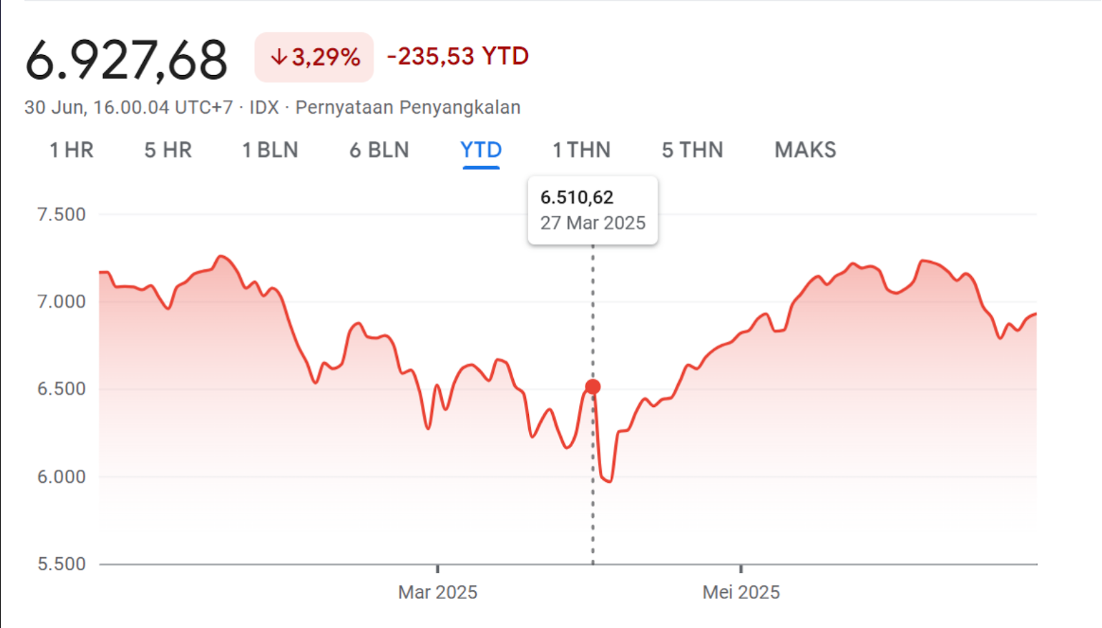 Tidak hanya di pasar valuta asing, gejolak juga terjadi di pasar modal. Indeks Harga Saham Gabungan (IHSG) tercatat mengalami koreksi hingga 9,19% sejak awal tahun. Koreksi tajam ini dipicu oleh aksi jual dari investor asing maupun domestik yang memilih keluar dari pasar ekuitas dan mengalihkan dananya ke aset yang dianggap lebih aman, seperti emas ataupun yang lainnya. Penurunan IHSG tidak hanya berdampak pada investor, namun juga menjadi cerminan menurunnya kepercayaan terhadap prospek ekonomi Indonesia dalam jangka pendek hingga menengah.